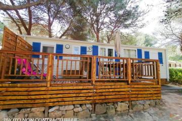 Mobil home pour 2/6 personnes, tout équipé de 40m²comprenant : grand frigo avec congélateur 3 tiroirs, micro-onde, four, lave-vaisselle tout intégré ainsi qu’une cafetière et grille-pain.