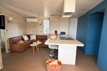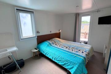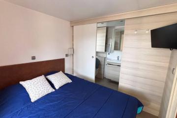 One bedroom with 1 double bed (160cm x 200cm), a second bedroom with 1 bed 160 x 200 cm, 2 shower rooms, WC, duvets + pillows, cot, baby chair, large fridge, fitted kitchen, dishwasher, microwave, capsule coffee machine (Dolce Gusto), dining area, crockery, terrace, garden furniture.