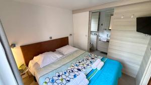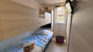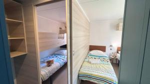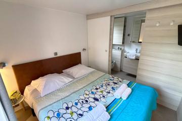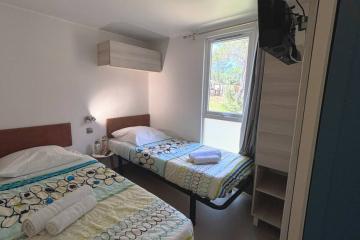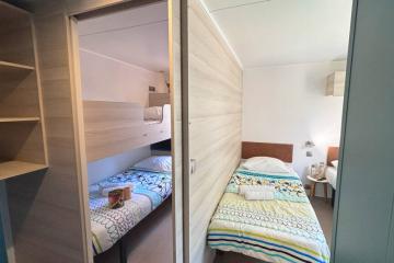 One bedroom with 1 double bed (160cm x 200cm), one bedroom with 2 single beds (70cm x 190cm) and one bedroom with 2 bunk beds (one bed: 80cm x 180cm and one bed: 70cm x 180cm), duvets + pillows, 2 shower rooms, WC, large fridge, equipped kitchen, dishwasher, microwave, capsule coffee maker (Dolce Gusto), dining area, crockery, garden furniture.