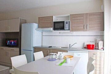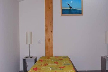 Cet appartement de 43 m² environ, est composé d'une chambre avec lit double (160x200), une chambre avec 1 lit simple (70x190) et 1 lit gigogne (70x190), un salon avec 1 canapé convertible 2 personnes (140x190), une kitchenette équipée avec lave-vaisselle, une salle d'eau avec douche, lavabo, WC et lave-linge. La télévision et le WiFi (pour 1 seul et même appareil) sont offerts. Cet appartement est spécialement conçus pour accueillir les animaux domestiques (avec supplément).