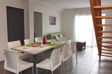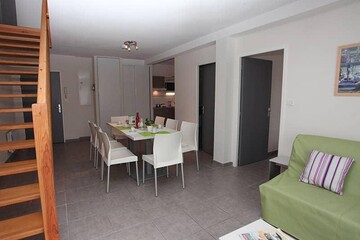 Cet appartement de 64 m² environ, est composé d'une chambre avec lit double (160x200), une chambre avec lit double (140x190), une chambre avec 1 lit simple (70x190) et 1 lit gigogne (70x190), un salon avec 1 canapé convertible 2 personnes (140x190), une kitchenette équipée avec lave-vaisselle, une salle d'eau avec douche, lavabo, WC et lave-linge. La télévision et le WiFi (pour 1 seul et même appareil) sont offerts. Cet appartement est spécialement conçus pour accueillir les animaux domestiques (avec supplément).