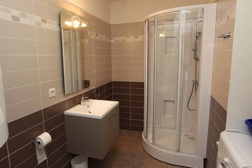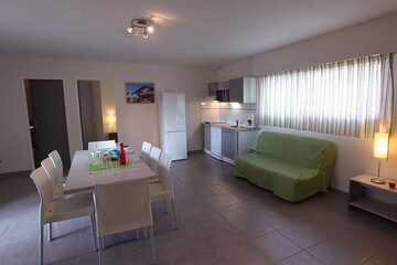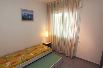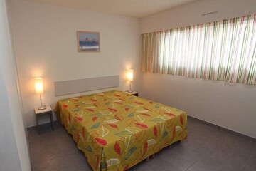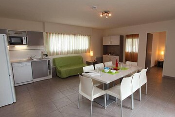 Cet appartement de 63 m² avec balcon ou terrasse, est composé d'une chambre avec lit double (160x200), deux chambres avec 1 lit simple (70x190) et 1 lit gigogne (70x190), un salon avec 1 canapé convertible 2 personnes (140x190), une kitchenette équipée avec lave-vaisselle, une salle d'eau avec douche, lavabo, WC et lave-linge. La télévision et le WiFi (pour 1 seul et même appareil) sont offerts.